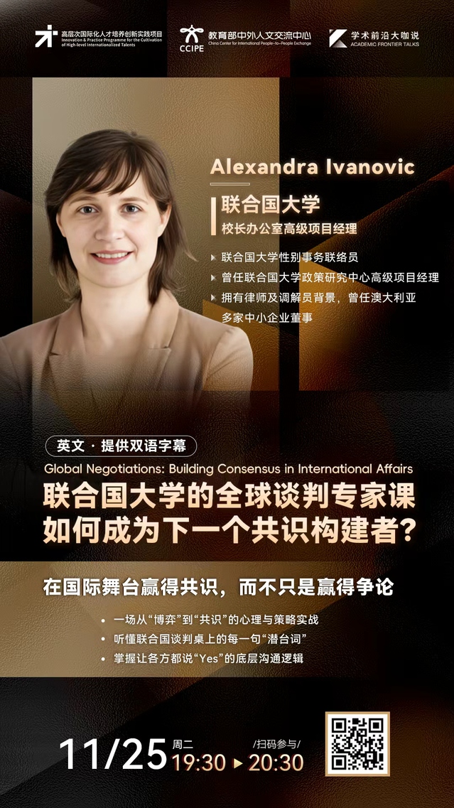 学术前沿大咖说 | 联合国大学的全球谈判专家课:如何成为下一个共识构建者?(2025年11月25日 19:30-20:30,主讲人:Alexandra lvanovic)